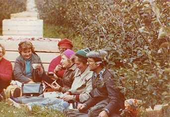 Gunilla Engelbrekt sorterar äpple i det gamla packeriet, någon gång på 70-talet. Av leendet att döma håller äpplena god kvalitet.